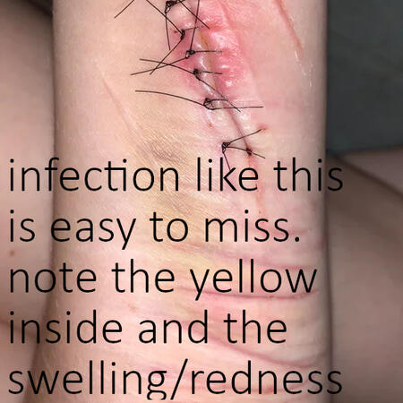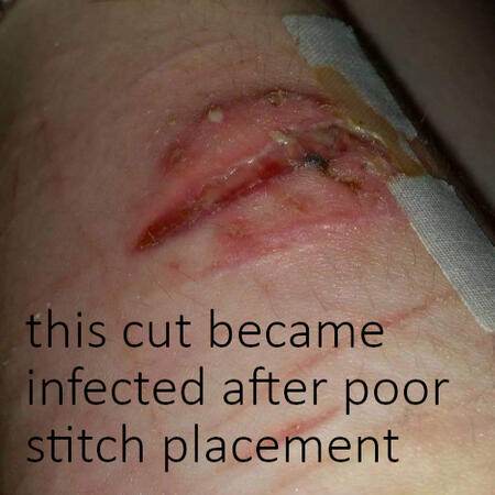 infection is when bacteria or other microcellular organisms (living things we can't see with our normal eyes) are within a wound and our body is attempting to kill it. this section contains photos of infection.