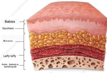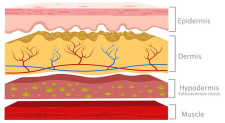 the hypodermis is where skin fat is stored as well as connective tissue and larger blood vessels. this layer appears bubbly and yellow from the fat tissue, giving its cut nickname as beans.